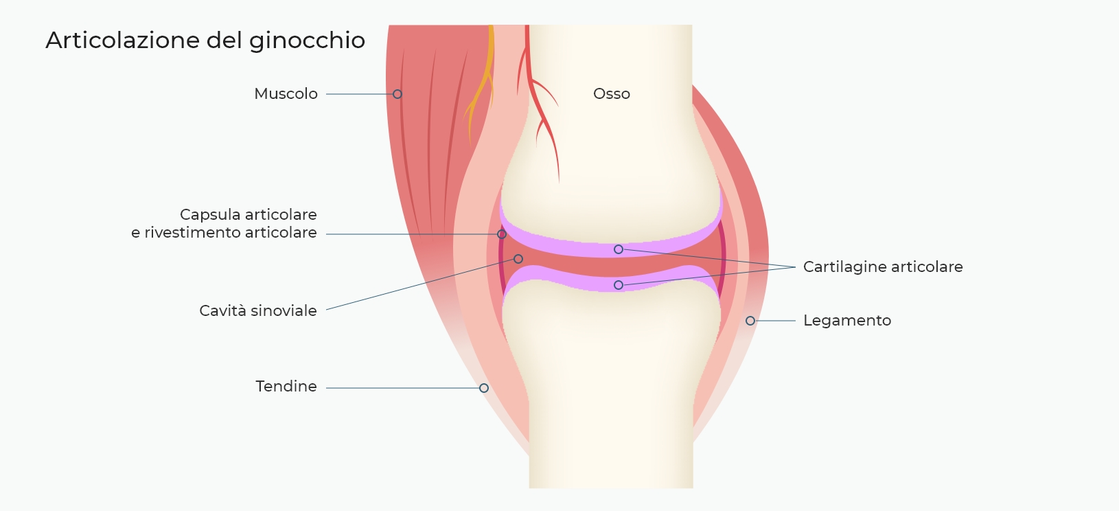 Le estremità delle ossa di un’articolazione sono ricoperte dalla cartilagine, deformabile ma elastica, e sono tenute in sede dai legamenti, che impediscono alle estremità ossee di allontanarsi oltre un certo limite. Inoltre, le articolazioni possono contenere un fluido, chiamato liquido sinoviale, che facilita lo scorrimento delle ossa durante il movimento. Il liquido sinoviale si trova in una cavità ricoperta da un tessuto definito membrana sinoviale.